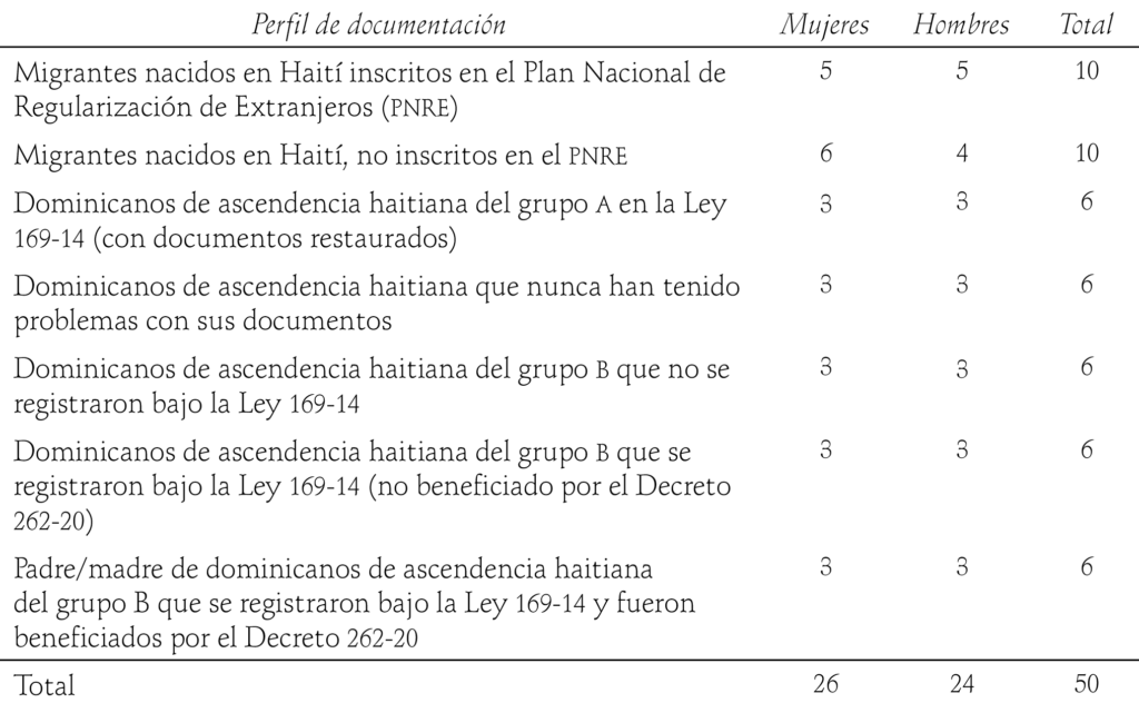 En octubre de 2020 un equipo de investigación de Obmica llevó a cabo 50 entrevistas semiestructuradas con personas de distintos perfiles de documentación, todas ellas padres o madres de hijas e hijos nacidos en territorio dominicano en los últimos cinco años. El cuadro 1 resume el número de participantes, por perfil y género.