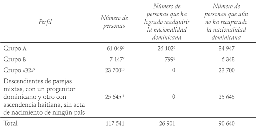 Del grupo A 34 mil 947 personas aún no han recuperado su nacionalidad dominicana como se había ordenado en la Ley 169–14. En adición, hay personas con documentos suspendidos que no figuran en la lista producida por la JCE. Del grupo B ni una sola persona registrada bajo el régimen especial establecido por la Ley 169–14 ha sido naturalizada a pesar de los decretos presidenciales que se explicarán a continuación. Gran parte de este grupo ha permanecido con cédulas de extranjero o carnet de regularización que ya ha perdido vigencia, sin que las instituciones competentes hayan definido los procedimientos para la renovación y eventual naturalización.